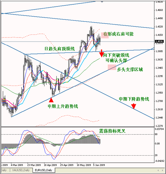 在我们所观察的交易品种中,只有原油、股指仍保持较好的上升趋势。英镑和澳元也还算较强,欧元、瑞郎、加元、纽元、黄金、白银等等上涨动能都已减弱。日元早已启动跌势,并且面临进一步向下突破。综合起来,在美元中期走弱的大形势下,展开一轮较大反弹的可能性越来越大。上周我们分析了欧元对美元,认为1.4336是否会成为一个下跌的起点,需要特别关注。一周来的走法,该点成为下跌起点的概率在增加。今天我们放大到日图上作更细致的观察。