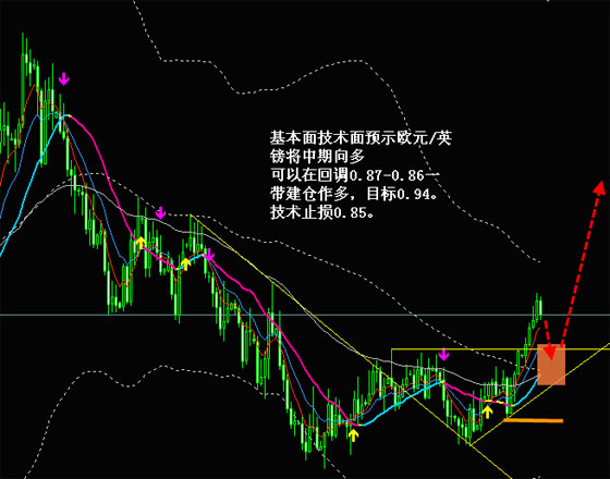短线方面,英镑超卖严重,预计下周对美元、日元、欧元等都会有所反弹。可以抓一些短线机会。另外,上周我们分析了欧元/英镑可能重新启动周趋级别的多头行情。目前这一态势更加明朗。本周我们进一步分析未来可能入场点和风险控制点。