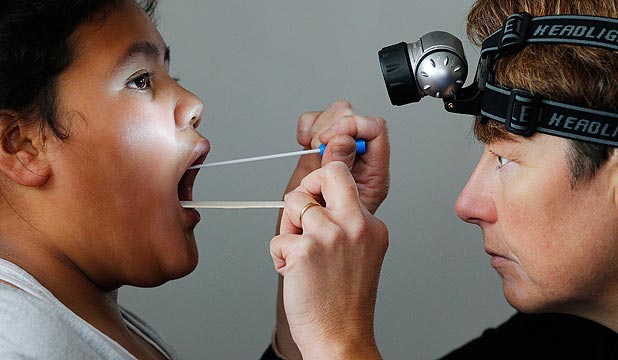 公共卫生机构的护士戴安娜•默多克(Dianne Murdoch)清河学校(Cannons Creek School)每周两次为学生做清喉治疗,确保已感染的儿童接受10个疗程的抗生素治疗。