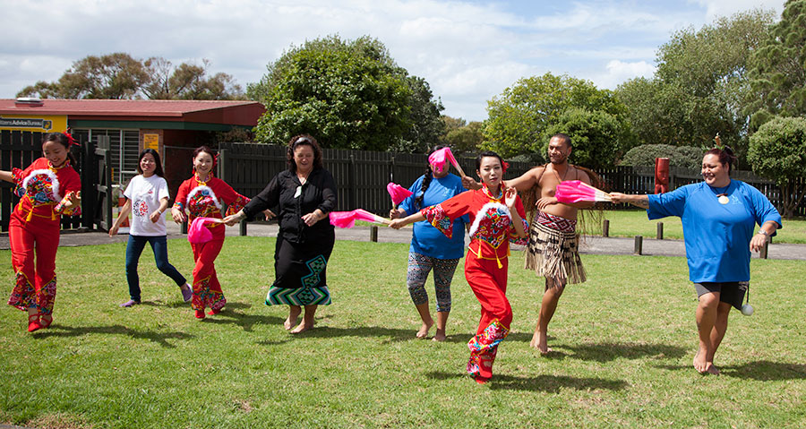 在溫暖的太陽下面,這裏祥和的氣氛使人們心情平靜的的享受著精彩的文化表演、特色的文化課程和豐富的美食。毛利人跟我们的舞蹈演员学扭秧歌,我们跟他们学HAKA战舞,POI 舞,毛利人教我们用NZ FLEX草葉编織,我們則教他們打中華結,毛利人請我們吃他們的食物HANGI,我們請教他們包餃子吃餃子。大家融洽的在一起其乐融融。