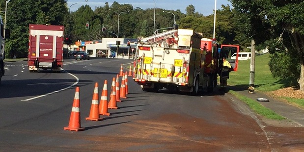 消防局发言人Jarron Phillips说,胶水洒在奥克兰Papakura郊区Beach路与Great South路的交叉口。