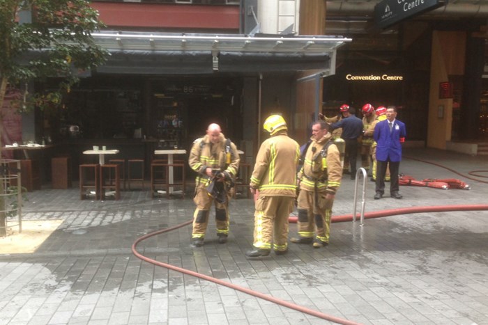 浓烟从大楼滚滚冒出,并可以从邻近的街道闻到。