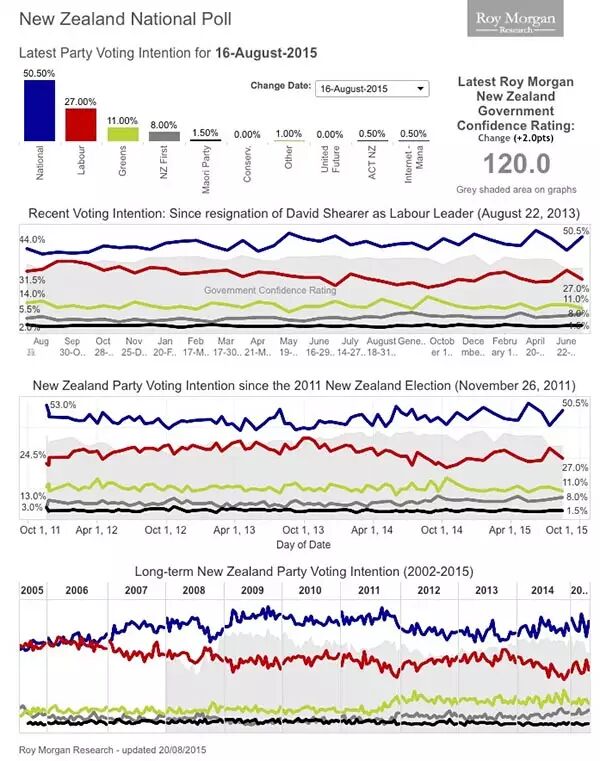 结果显示,如果将这次民调选做选举结果,国家党将会毫无疑问地胜出。包括支持者毛利党1.5%,联合未来党(拥有1个席位)、行动党0.5%,国家党方面将总共拿到52.5%的选票。而反对党方面,工党只占有46%的选票,绿党及优先党能否结成反对党联盟尚存变数。