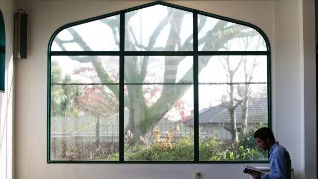 拱形窗的外面,一片平静的新西兰宅院,这里是新西兰穆斯林社区。