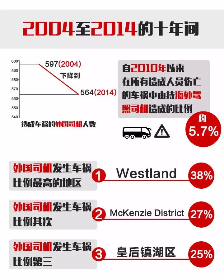 自2010年以来,在所有造成人员伤亡的车祸中,由持海外驾照司机造成的比例近为5.7%。而实际上,虽然游客数量激增了25%,但过由海外司机造成的车祸数量却由2004年的597下降到2014年的564