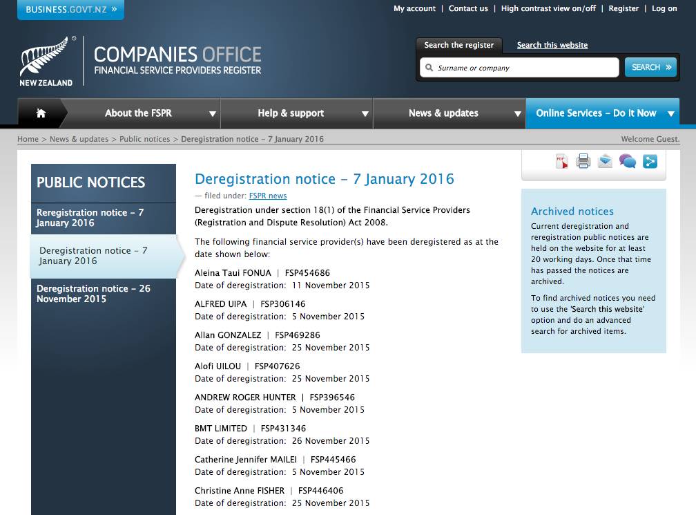新西兰中国城网 网讯 新西兰金融服务提供商注册(FSPR)日前在官网发出告称,2015年11月份总共撤销66家公司和个人的注册资质。FSPR在9月份撤销119家公司和个人资质,10月份这个数字达到155家。2016新年刚过,1月7日又撤销了一批公司和个人。