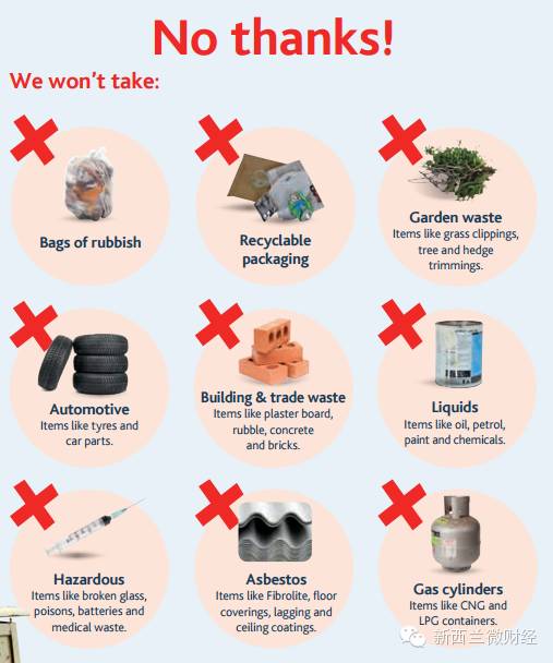 不能扔的包括花园垃圾、绿色垃圾等,请自己处理,建筑材料如木板胶合板、水泥块、砖头等都是不收的,请不要放在一起;不收的还包括液体、涂料等,这些材料有专门的扔的地方,不在市议会收取范围内。其他不可扔的材料可查询市议会网站。