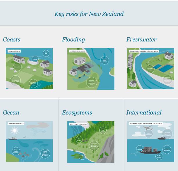 报告说,全球变暖导致海平面上升,海水会不断侵蚀新西兰的海岸,导致在风暴期间洪水等自然灾害更易发生。目前,多数新西兰人居住在沿海地区,三分之二的新西兰人居住在容易受到洪水威胁的地区。