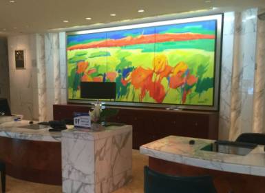 这幅《杭州•荷》是晨晓为家乡杭州所作的画,现在已被被杭州黄龙饭店收藏,作为大堂总台背景。