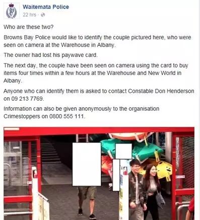一名失主向警方报告遗失了一张购物卡,第二天,图上这两人就被监视器拍下在北岸Albany的the Warehouse(廉价超市)和New World超市内,在短短的数小时内四次使用报失的购物卡消费。