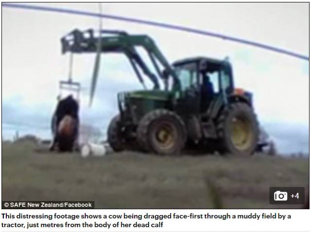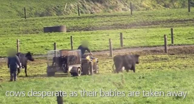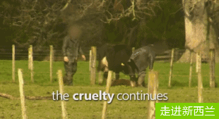 新西兰规定至少要让刚出生的小牛犊和母亲在一起团聚几天才能运走,可是新西兰农场工作人员不管这些,刚出生的小牛犊直接装车运走。它们的妈妈只能远远的跟着走几步,看着它们的孩子就这样被送往了刑场。▼