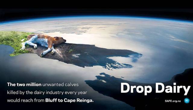 新西兰是一个乳制品大国,在这个国家里,每年会有200万只小牛犊,刚刚出生,就被迫和自己的母亲分离。它们还没有享受过一次阳光,就会被屠宰场的人杀掉,然后当成垃圾一样丢弃。如果它们的尸体连在一起,已经可以从新西兰这个国家的最南端摆到最北端了。