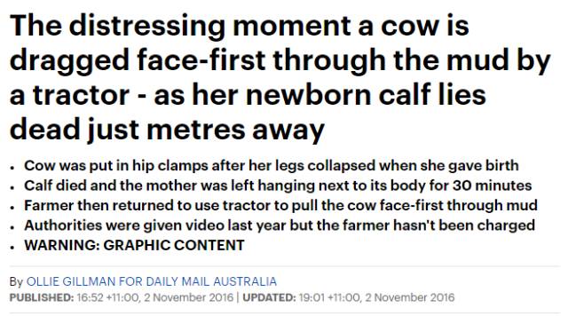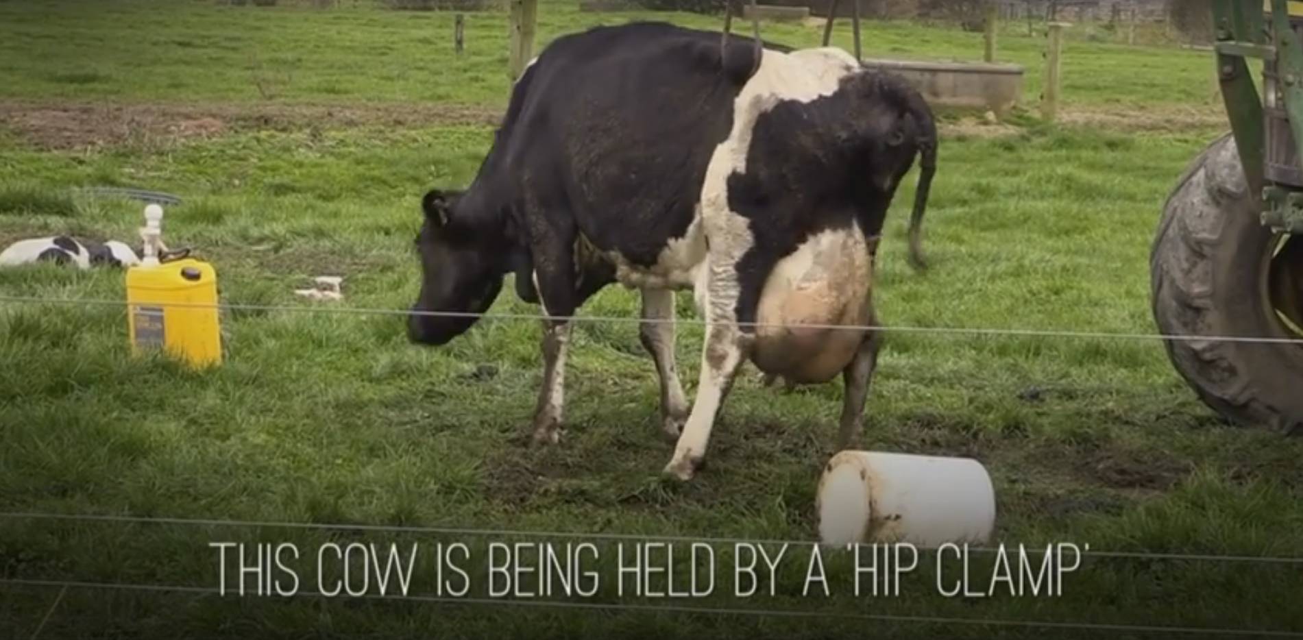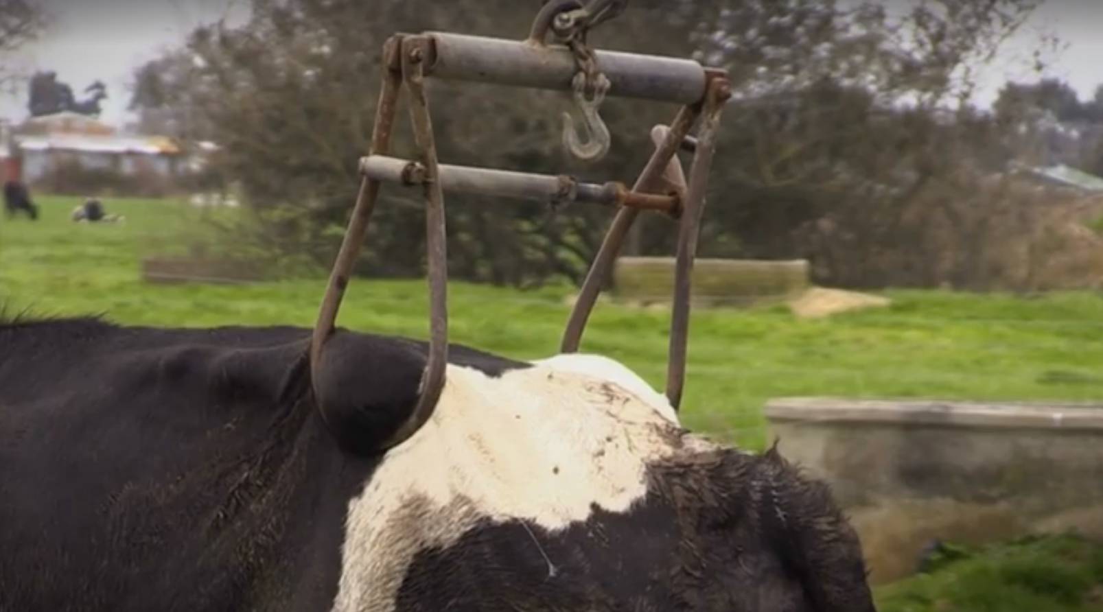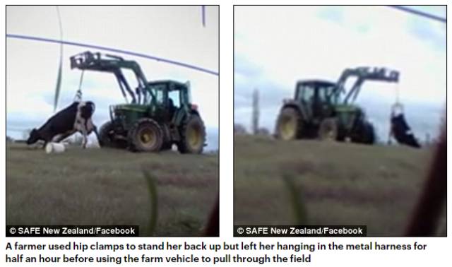 这种铁夹本来是帮助奶牛在分娩时候支撑地面的,但在新西兰一部分农场里,都发现了农场主们用它们残忍的限制奶牛移动。动物保护组织曾经将这部证据交到了相关部门,但至今,该农场主都没有受到任何惩罚。于是今天,动物保护组织将这段视频,通过每日邮报播放出来。希望可以得到更多的社会关注。