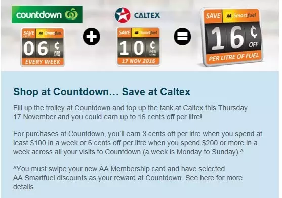 ^You must swipe your new AA Membership card and have selected AA Smartfuel discounts as your reward at Countdown. See here for more details.