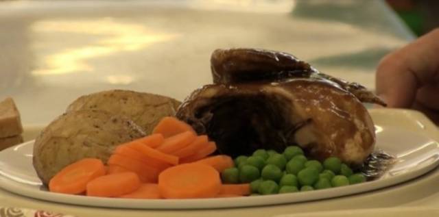 2014年半只烤鸡、肉汁、烤马铃薯、白灼胡萝卜、白灼四季豆,两片面包、再加苹果派(毫无新意...)。