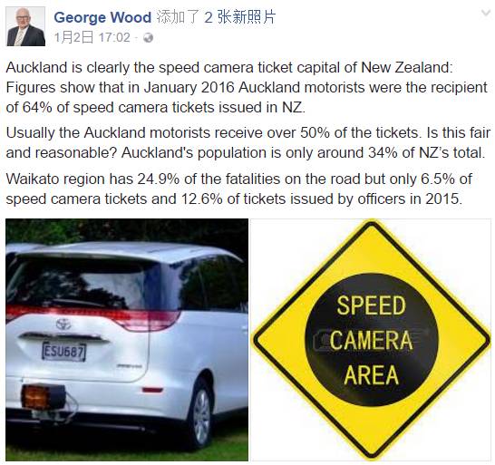 乔治伍德还抱怨道,怀卡托地区的恶性交通事故数量在全国占到了24.9%,但开出交通罚单数量只占了全国的6.5%。截止到去年12月底,奥克兰地区交通事故死亡人数有46人,但怀卡托却有77人死亡。警察却还是把抓超速的重点放在奥克兰,而不是其他地区,难道抓超速的目的不是为了减少交通事故吗?过去三年,怀卡托地区的交通事故致死率非常高,如果警察抓超速目的真是为了降低事故发生率,那么就应该多在怀卡托地区下些功夫。