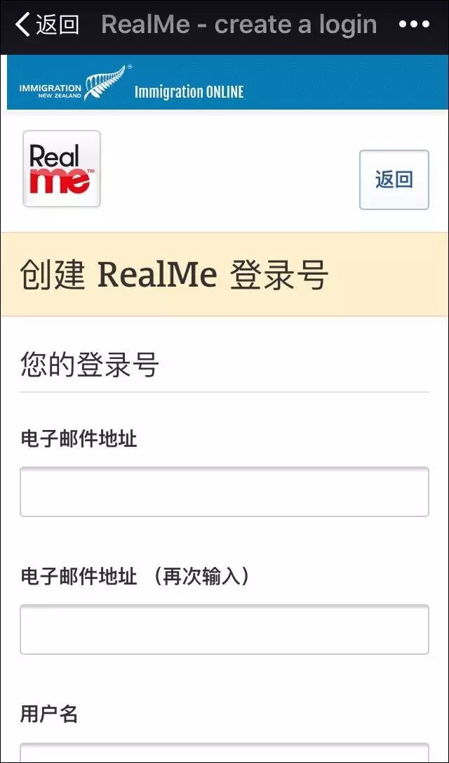 在该页面中,点击“创建您的RealMe登录号”,进入注册页面: