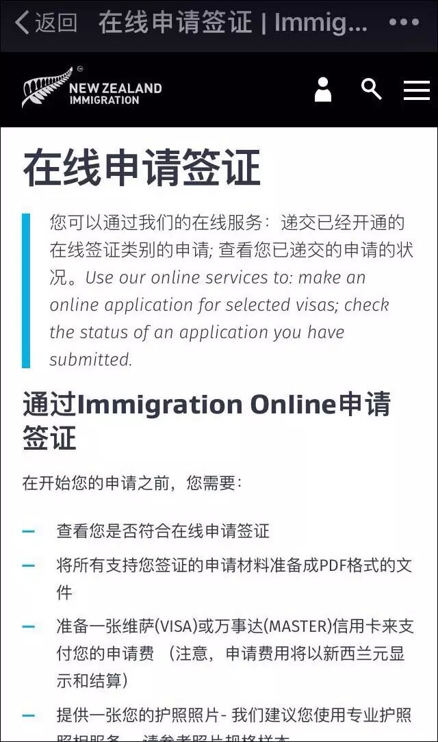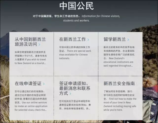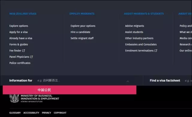 全是英文看不懂?别担心!新西兰移民局非常贴心地推出了中文系统,把页面拉到最下方,选择“访问新西兰”中“中国公民”的选项,跳转到中文页面。