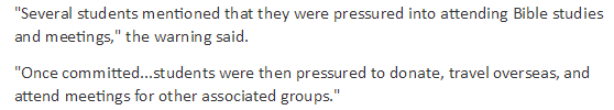 目前,奥克兰大学已经开始设立了一个专门的小组,来帮助那些子女被招募而受到影响的学生家长。除此之外,奥克兰大学警告称,他们已经注意到最近有一些学生提到,他们经常被迫参加圣经学习和回忆,在参与过后,这些学生就被迫捐款,去其他国家,或参加一些组织的会议。