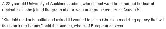 奥克兰大学一位来自欧洲的女留学生表示,当时她是在奥克兰的皇后大街上走着,突然一个女人接近了她,这个女人告诉这位女学生:“你很漂亮,希望邀请你做我们的基督教模特机构,因为我们很注重内在美”。
