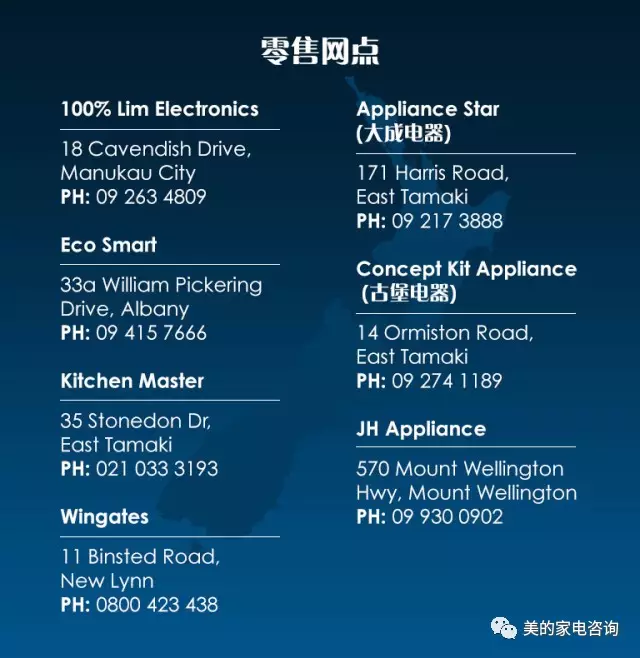 JH电器(JH Appliance),是美的授权的新西兰代理商,拥有最全的产品线。现在您可轻松至特约门店选购美的冰箱,微波炉,厨房电器,洗衣干衣机。不久的将来,万众期待的美的小家电,空调也将逐步落户新西兰。一站式服务,高品质保障。 美的电器,美的享受。
