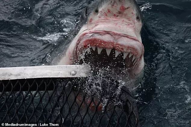 据这组照片显示,这只重约1360公斤的大白鲨咬住了鱼笼的一角,满嘴尖牙,一览无余。