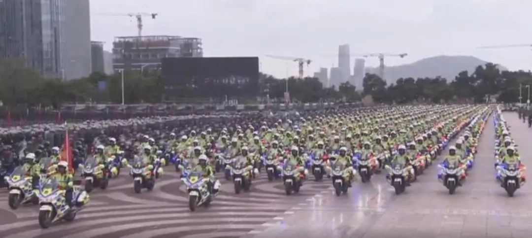 可以看到,有摩托车方阵、特种车辆方阵、警用直升机联合编队等。根据介绍,现场一共是50辆装甲车,200辆冲锋车。1200台铁骑摩托车,5架直升机,8艘船艇,2辆水陆两栖车以及其他装备分列周围。