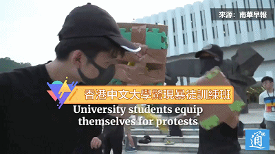 今年10月份,有港媒披露出学生抗争组织“香港大专学界国际事务代表团”在香港中文大学校内开办“暴徒训练班”,有大批高校学生在专业教练指导下进行专业化的“暴动训练”。