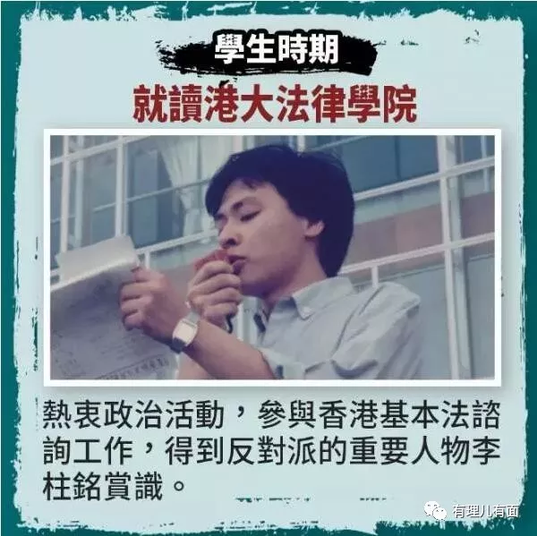 “港独之父”入门弟子 深藏政治背景多年戴耀廷1964年生人,上世纪80年代就读于香港大学法律系。大学时期的戴耀廷因担任学生会外务秘书一职,可以有更多机会接触社会政治,曾以学生身份参加《基本法》起草咨询工作,因丰富的理论知识和独道的政治见解,受到了“港独之父”李柱铭的关注和赏识。1986年,刚从港大毕业的戴耀廷便被李柱铭招收为法案助理,成为李麾下重点培养的“港独”骨干之一。